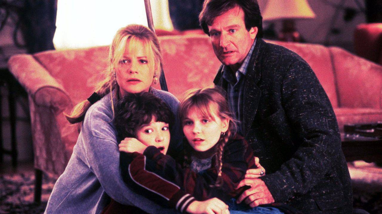 When siblings Judy and Peter discover an enchanted board game that opens the door to a magical world, they unwittingly invite Alan -- an adult who's been trapped inside the game for 26 years -- into their living room. Alan's only hope for freedom is to finish the game, which proves risky as all three find themselves running from giant rhinoceroses, evil monkeys and other terrifying creatures.